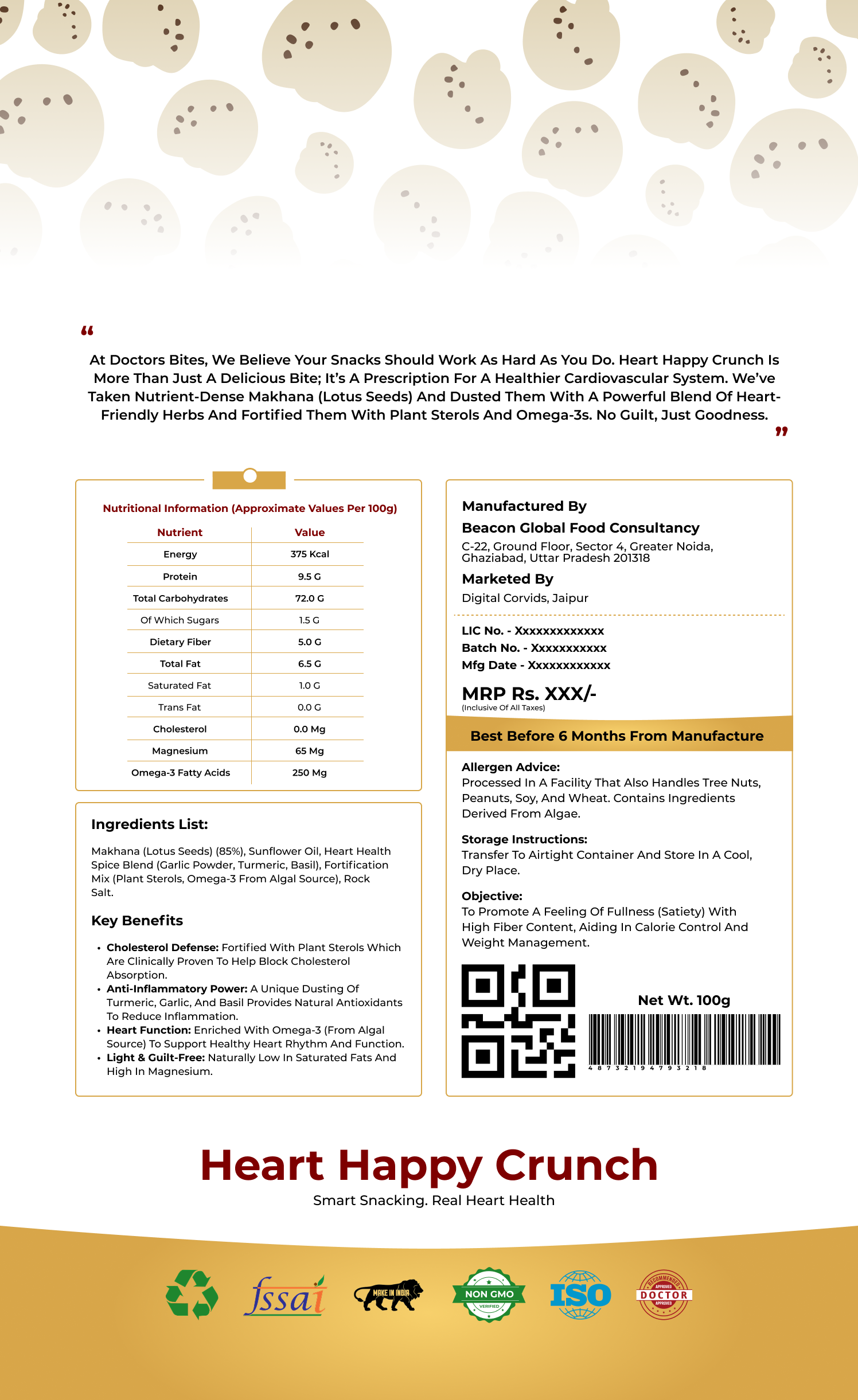 Snack for your heart, not against it. Doctors Byte Heart Happy Crunch is a light, baked makhana (lotus seed) snack crafted to support cardiovascular health without sacrificing taste. Each crunchy bite combines naturally low-fat lotus seeds with a heart-healthy herb blend and scientifically backed fortification (plant sterols + algae-based omega-3). It is baked, not fried, using only a light sunflower oil coating. The product contains no artificial flavors, no artificial colors, no MSG, and no trans fats. It is 100% vegetarian and suitable for most diets. Heart-focused ingredients are used that are recognizable and trustworthy.