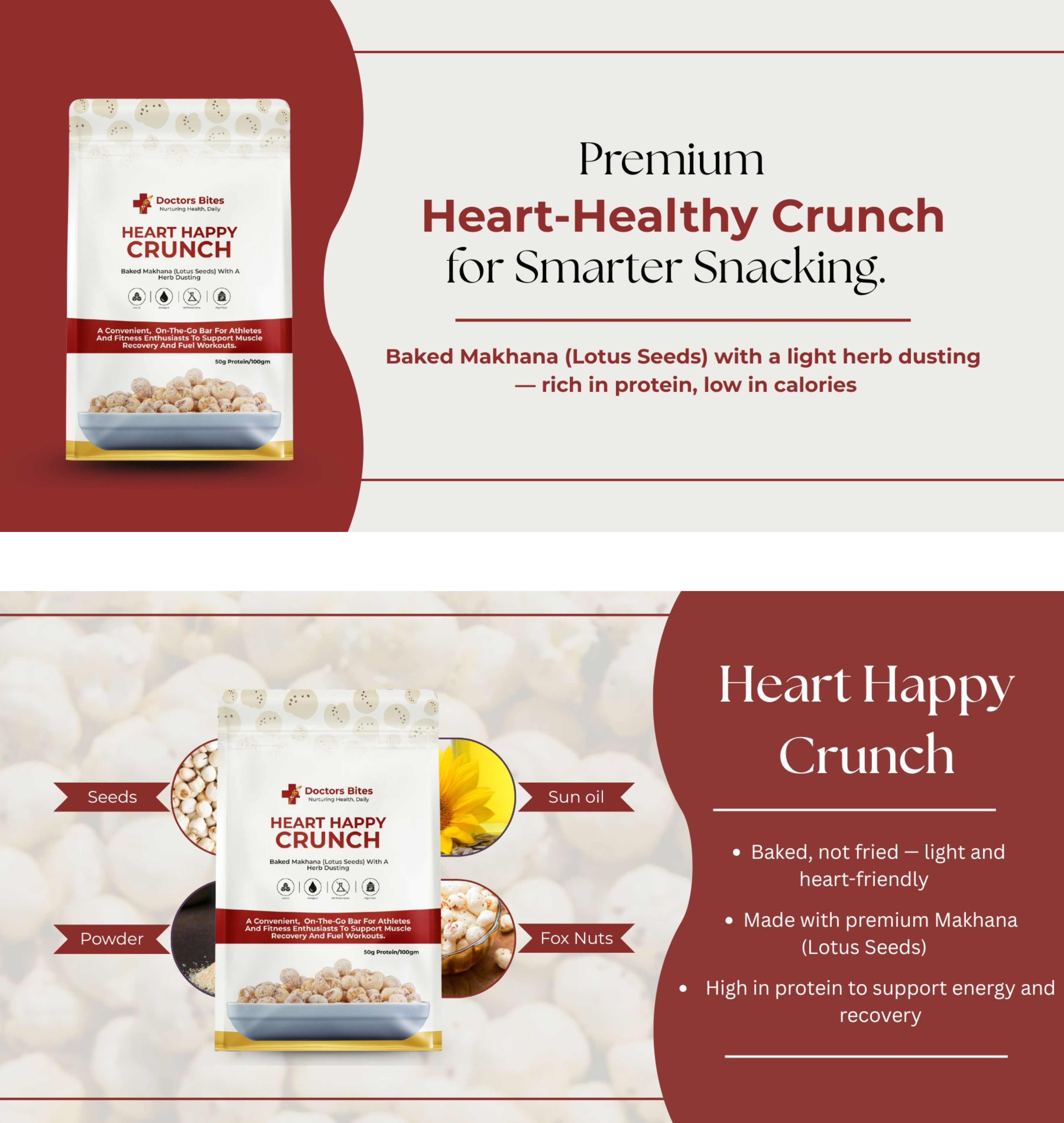Snack for your heart, not against it. Meet Doctors Byte Heart Happy Crunch, a light, baked makhana (lotus seed) snack crafted to support cardiovascular health without sacrificing taste.