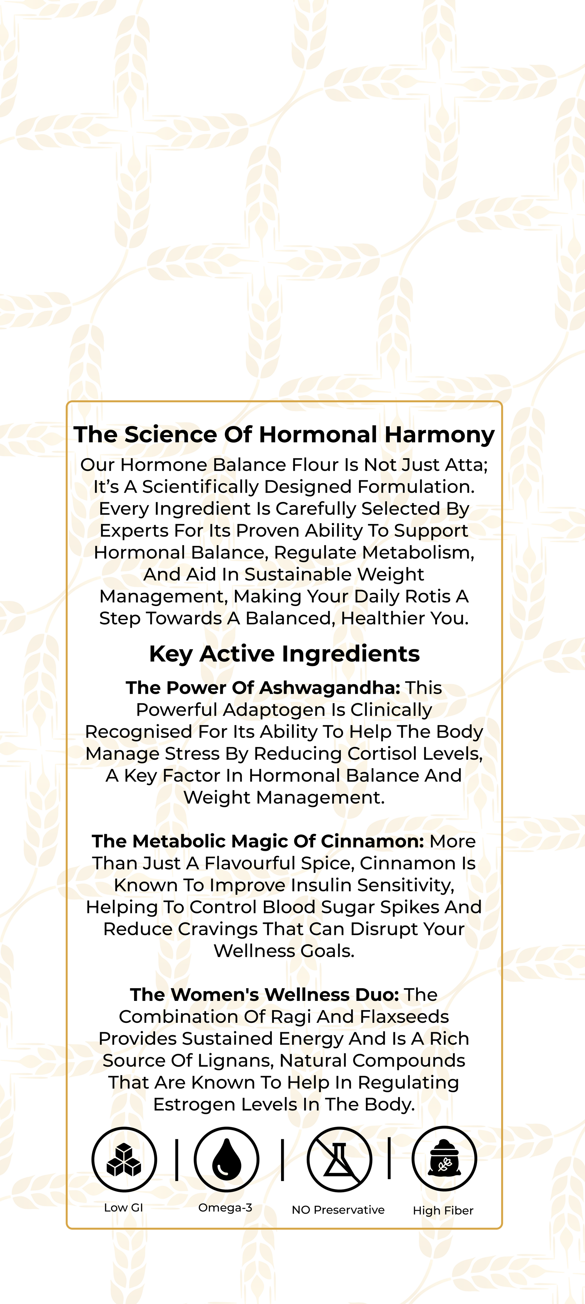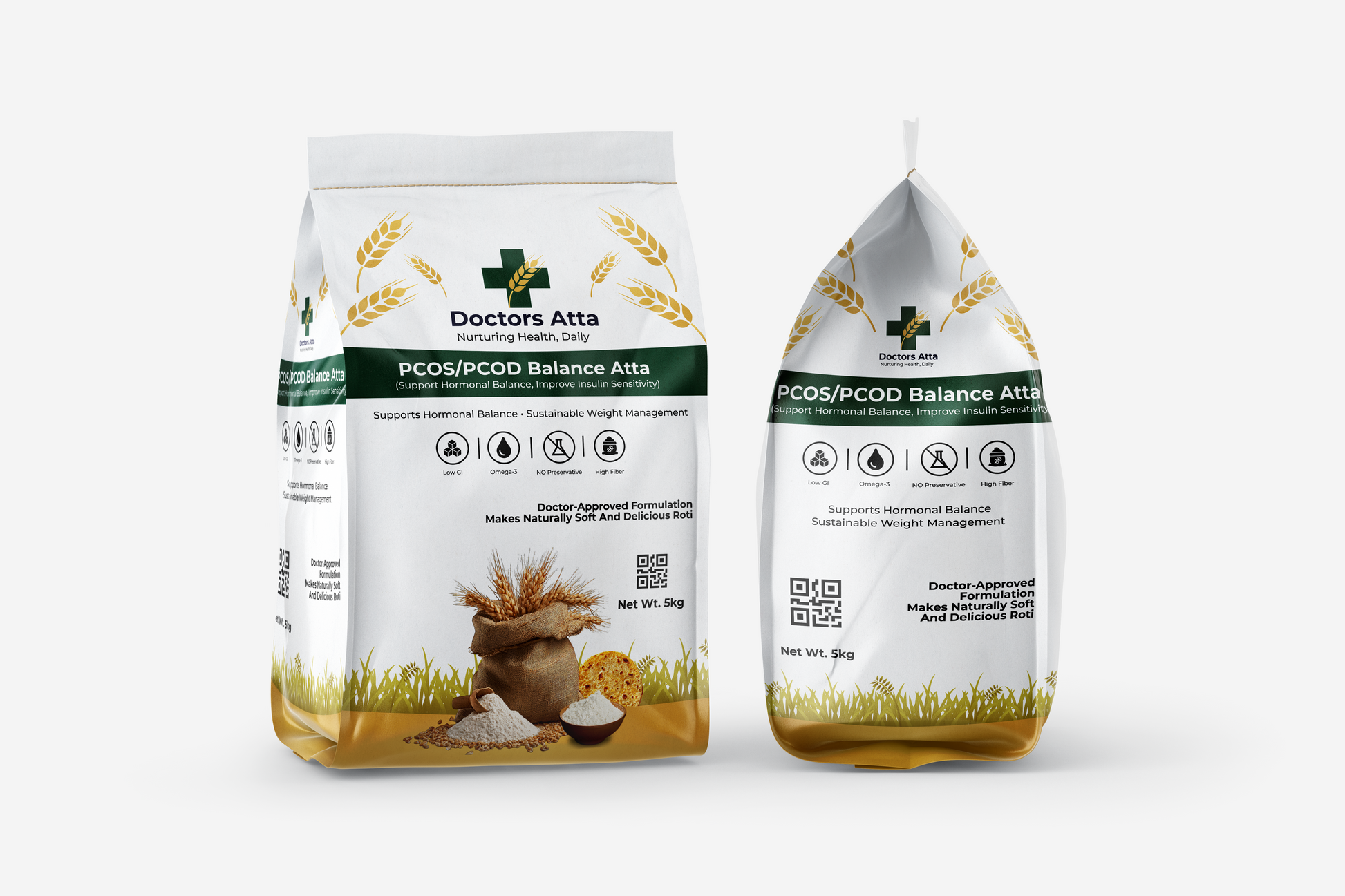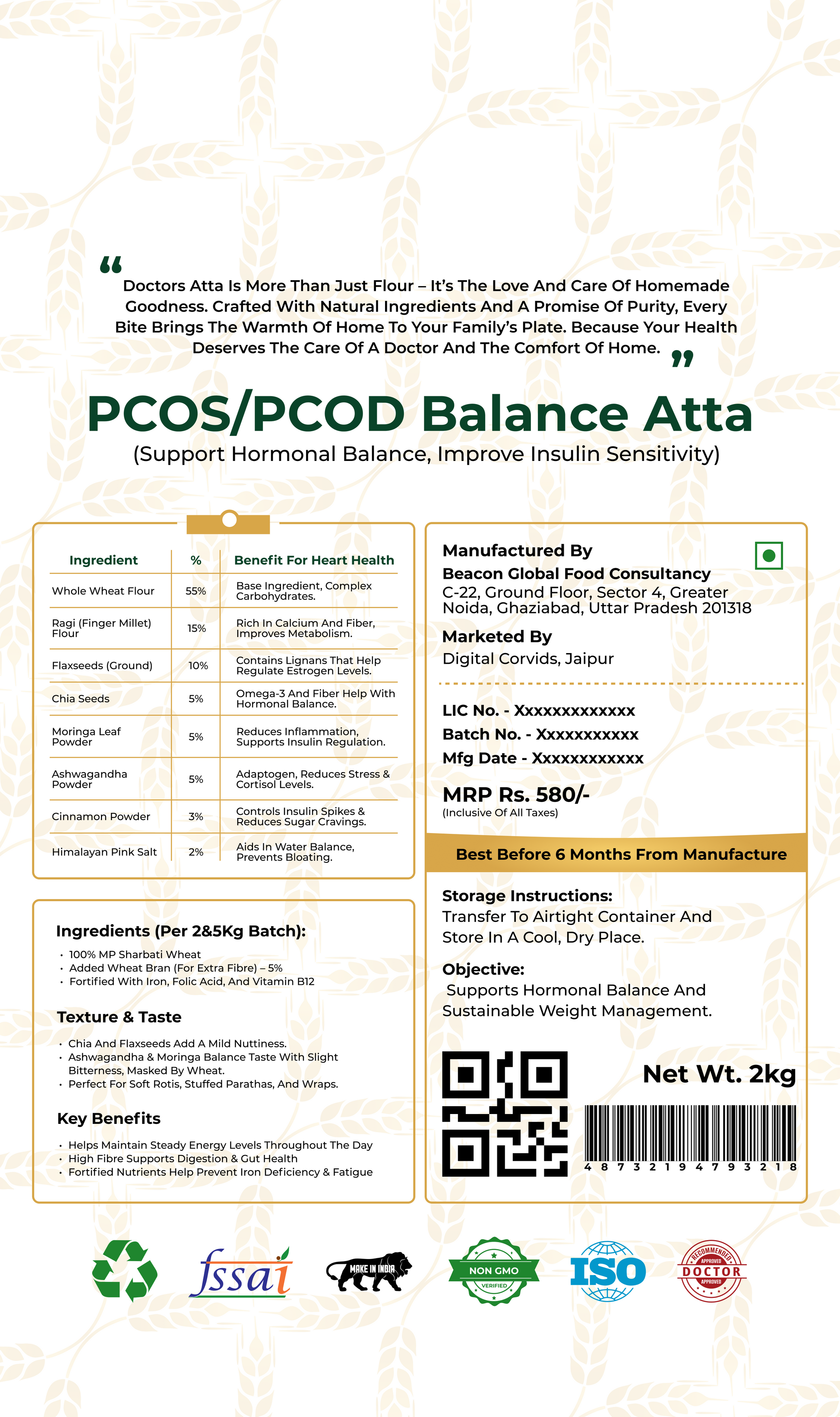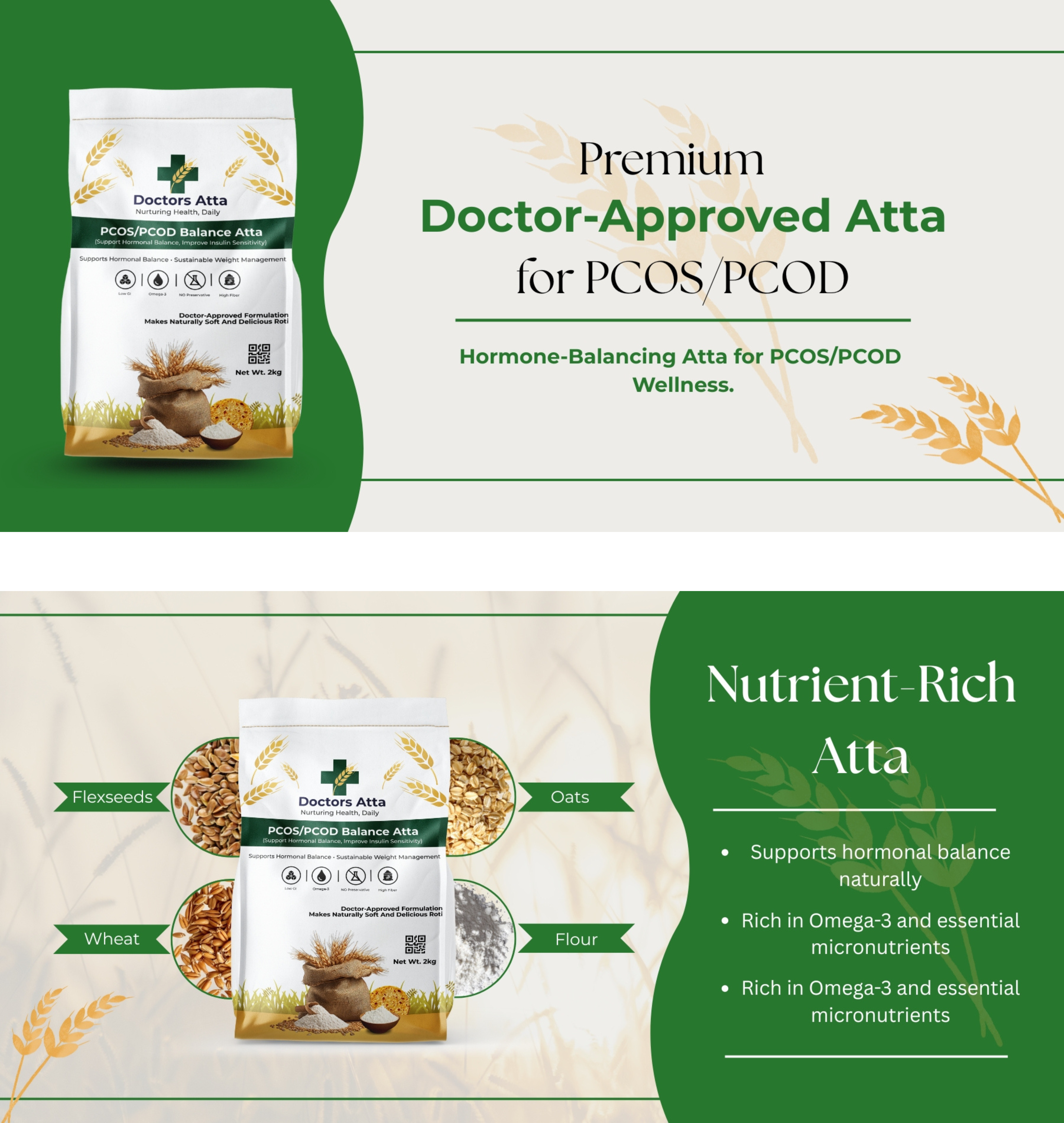 Nourishment for women’s wellness begins with Doctor Aata’s Women’s Wellness Blend, a specially formulated flour designed to support hormonal balance, regulate metabolism, and aid in sustainable weight management. This blend acts as a daily nutritional ally for women, especially those dealing with PCOS/PCOD and hormonal fluctuations. It is crafted to help maintain steady energy levels, reduce cravings, support healthy metabolism, and manage stress-related weight gain. The formulation combines powerful adaptogenic herbs, blood-sugar-balancing grains, and nutrient-dense superfoods to deliver complete hormonal and metabolic support. The blend has a mild, nutty sweetness from chia and flaxseeds, while the slight bitterness of ashwagandha and moringa is carefully balanced to create soft, delicious rotis, stuffed parathas, and wraps.
