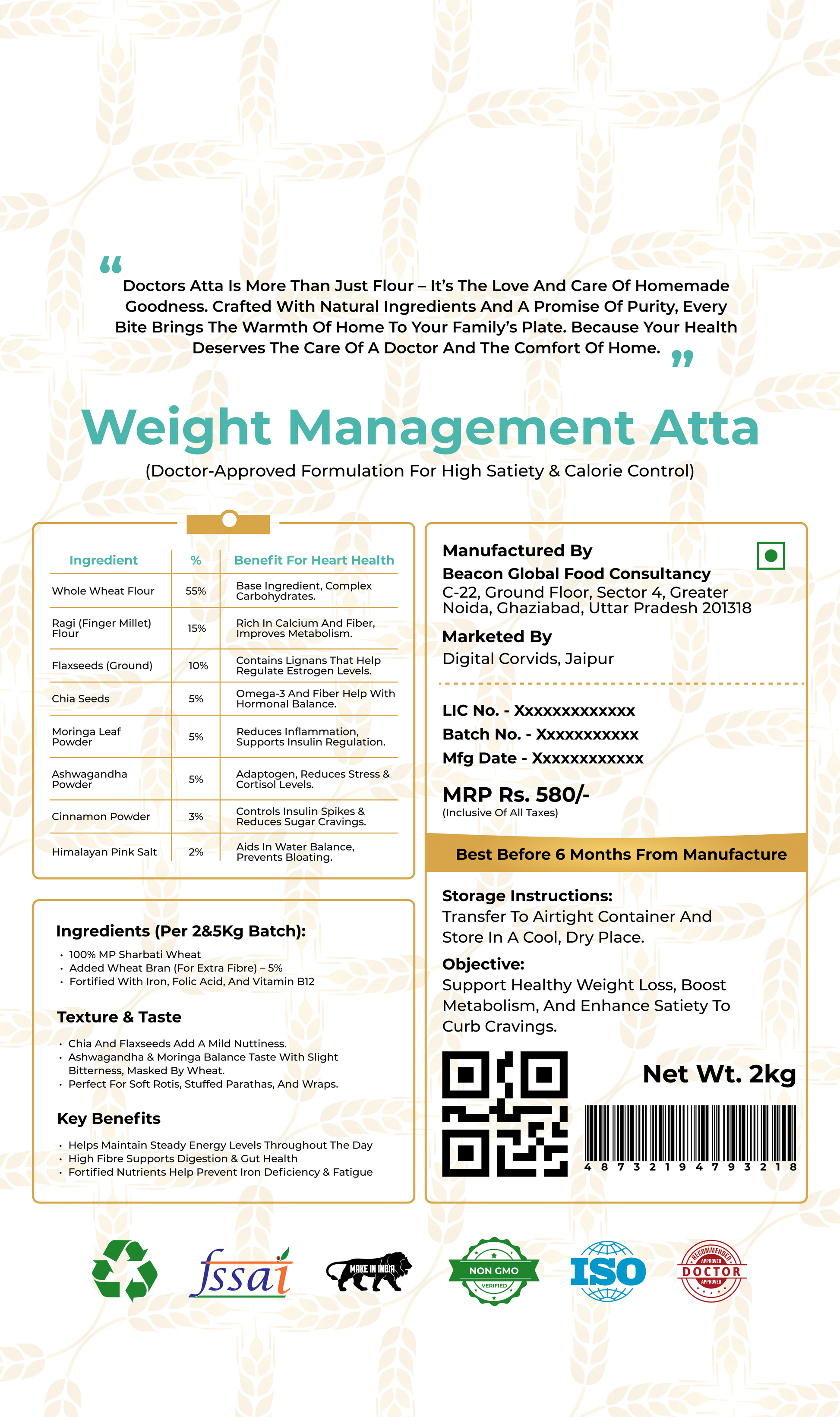 Make every roti work for your weight loss goals with Weight Management Aata, a specially formulated whole wheat flour crafted to support sustainable weight management through natural satiety and metabolic support. This unique atta combines high-fiber whole grains with metabolism-boosting herbs like ashwagandha and cinnamon, along with protein-rich and fiber-dense additions to help you feel fuller for longer. It is designed to stabilize blood sugar, reduce cravings, and support efficient metabolism while allowing you to enjoy your daily rotis as part of your weight loss journey. Fortified with essential nutrients, this atta supports energy levels and prevents deficiency-related overeating, making it a practical and effective daily dietary solution.